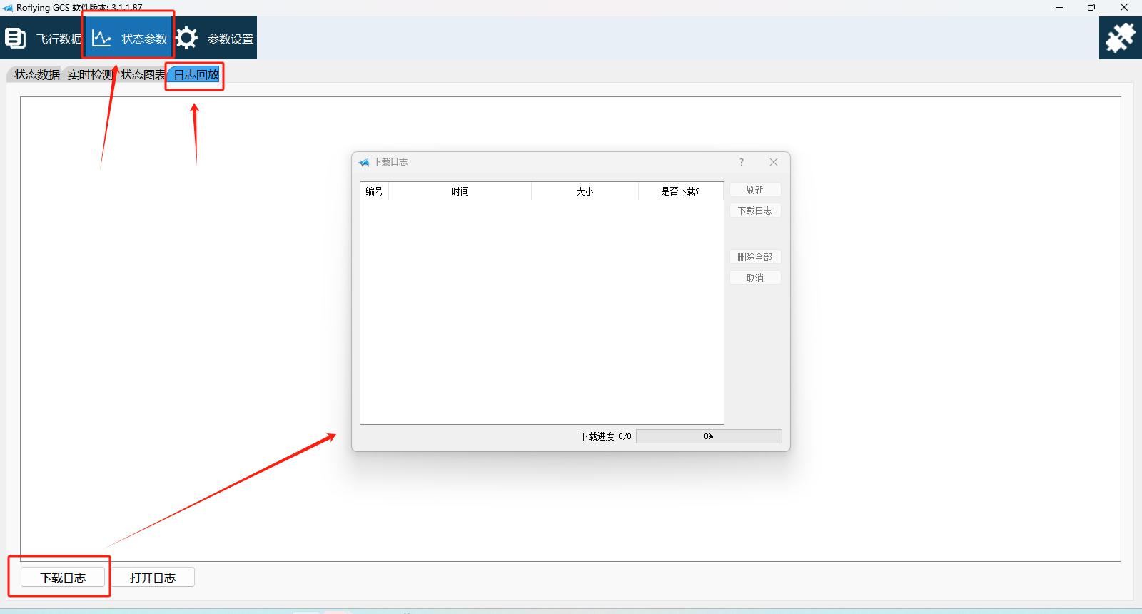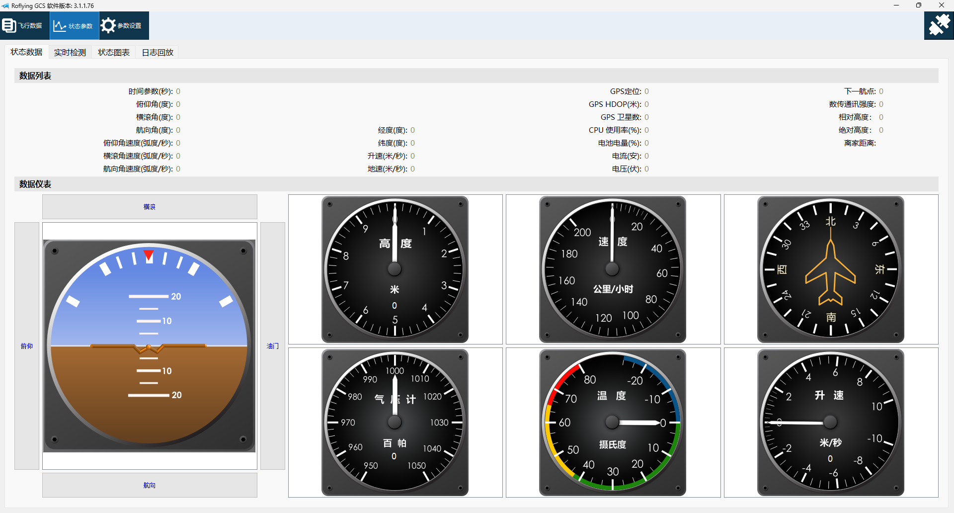 该页面是用于盲飞考试时候查看飞行器的各项数据的页面,另外还可以切换到实时检测和状态图表栏目,更直观的查看飞行器的实时数据,此外日志查看功能也在这个页面,但此时没有链接任何设备,因此没法下载日志,仅能加载已经下载过的日志文件