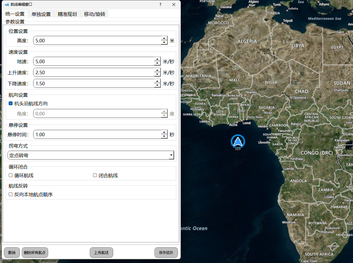 统一设置意味着该页面的所有设置选项均针对所有航点,修改完成后,点击保存修改,再上传航线,删除航点后,也需要保存修改并上传航线才能起效