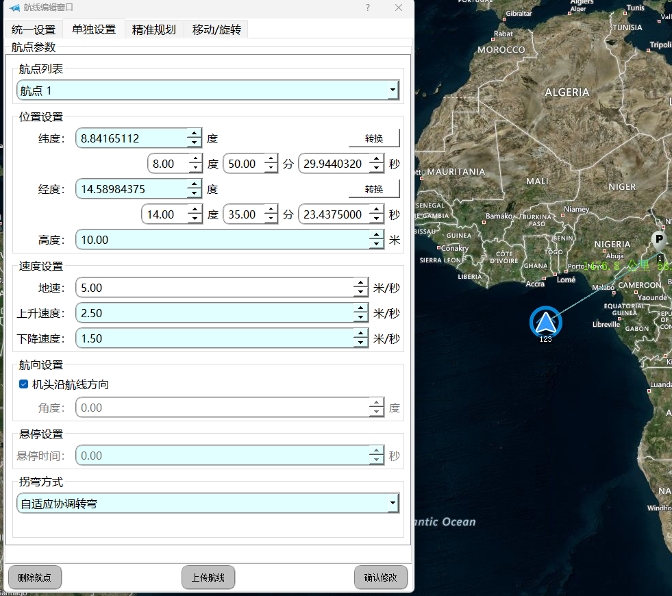 单独设置意味着该页面所有设置仅针对上方航点列表中选定的航点,修改完成后,点击保存修改,再上传航线,删除航点后也需要保存修改并上传航线才能起效