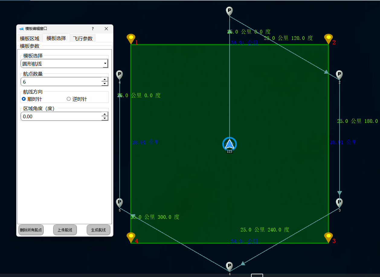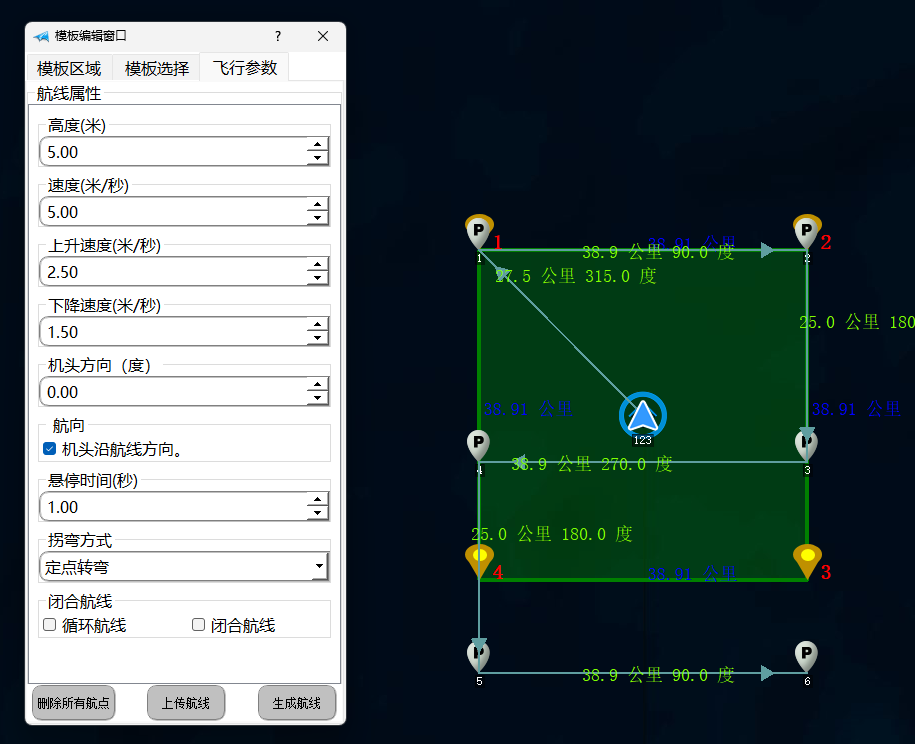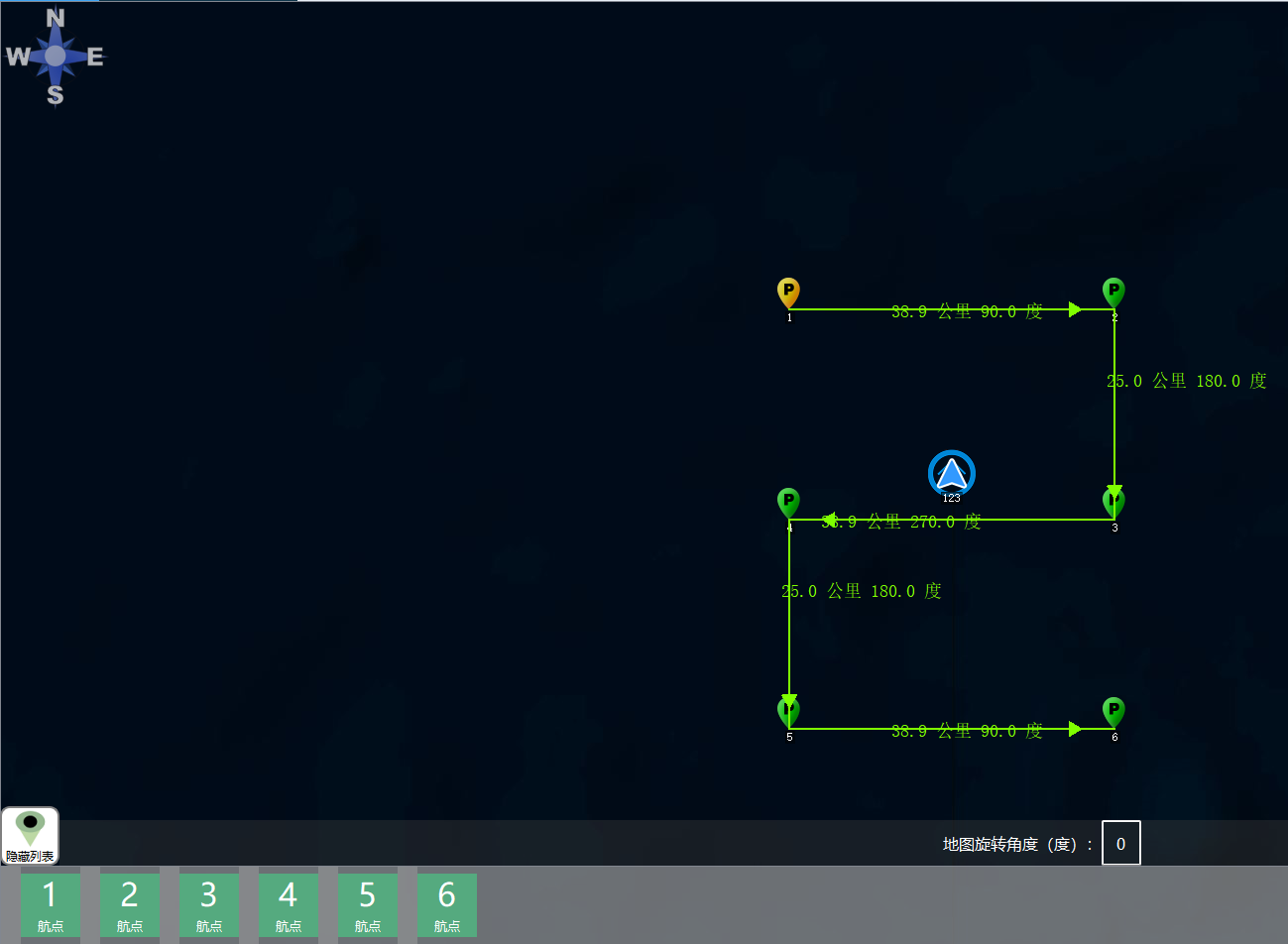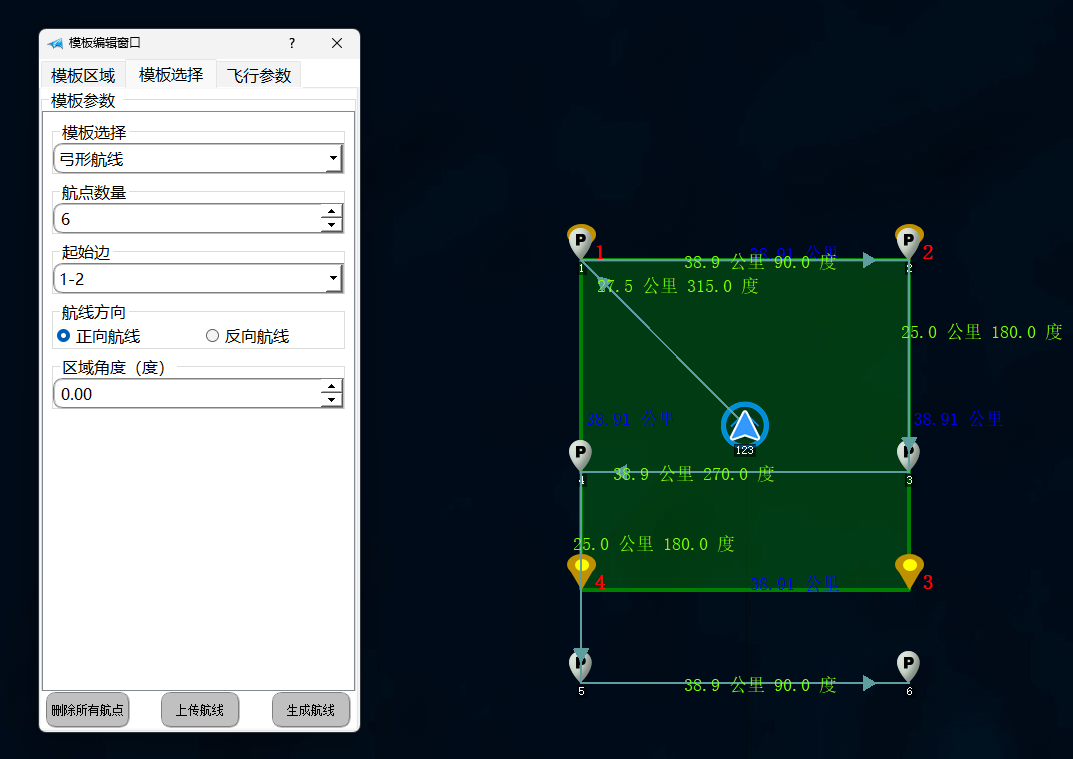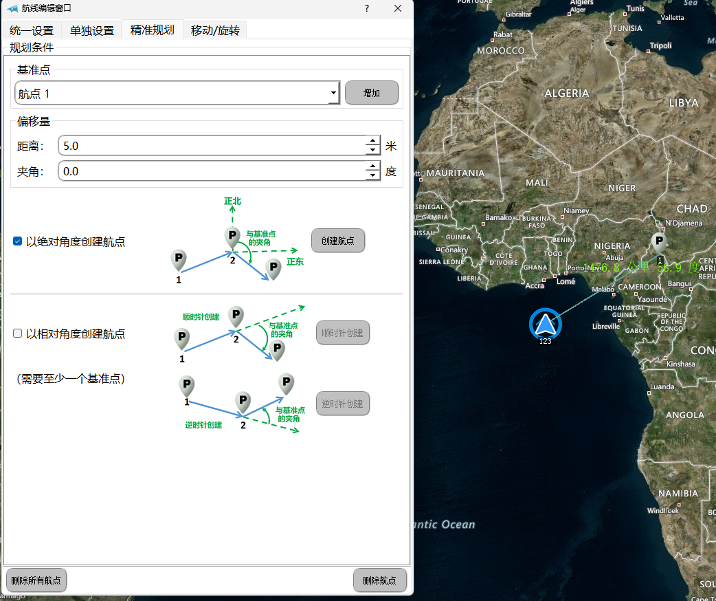精准规划意味着可以通过设定前后两个航点的精确距离和精确角度来创建航点,该功能首先要创建一个基准点,当生成目标航点后,基准点会变成已经生成的目标航点