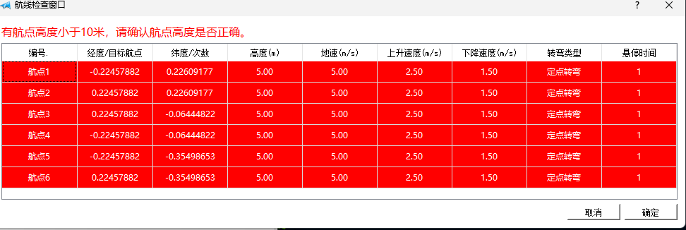 当航线规划好之后,点击上传航线,会出现航点信息的确认框,可以进一步确认航线规划的准确性与安全性