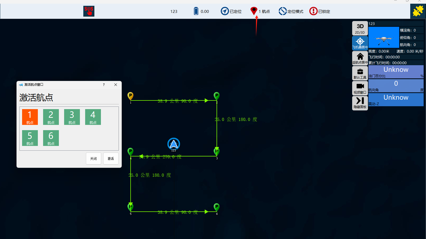 点击上方飞行器状态信息栏中的航点信息栏,会有一个激活航点窗口,点击上方的被跟踪航点后弹出激活航点的窗口,然后选择需要的航点为例),点击激活即可。航点激活后,飞行器将从被激活的航点开始自驾。