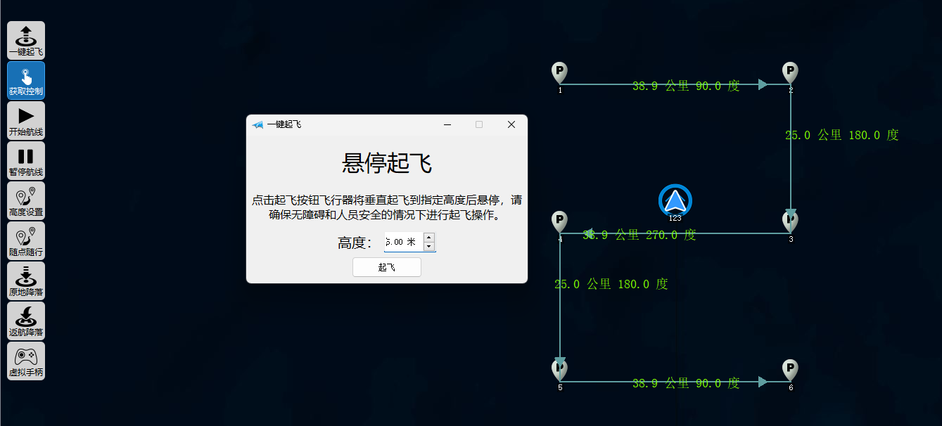点击后飞行器会自动解锁起飞到指定高度(默认 5m),