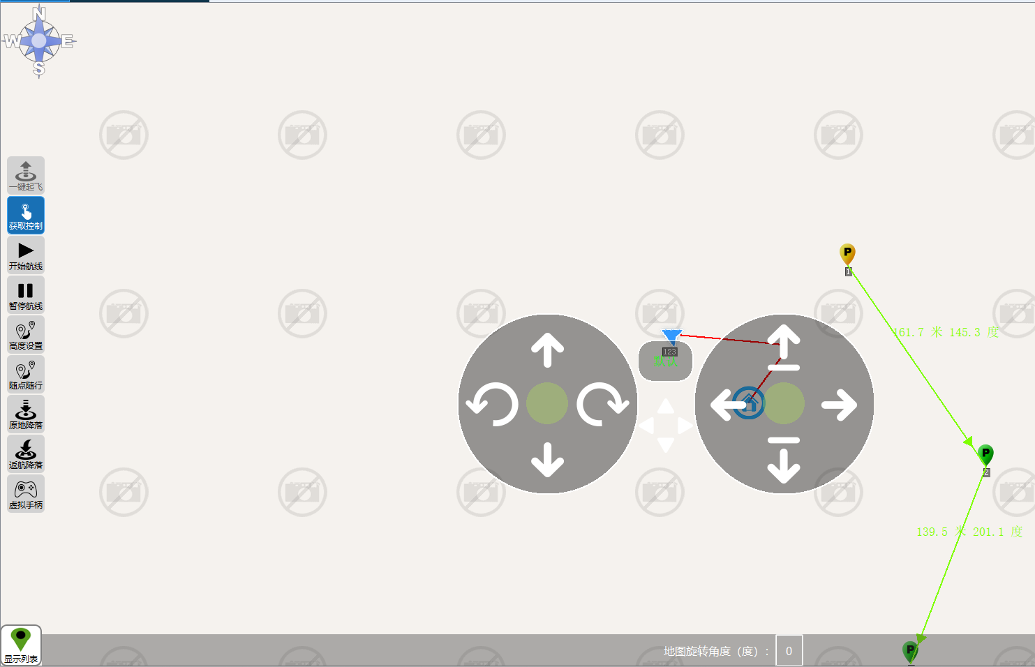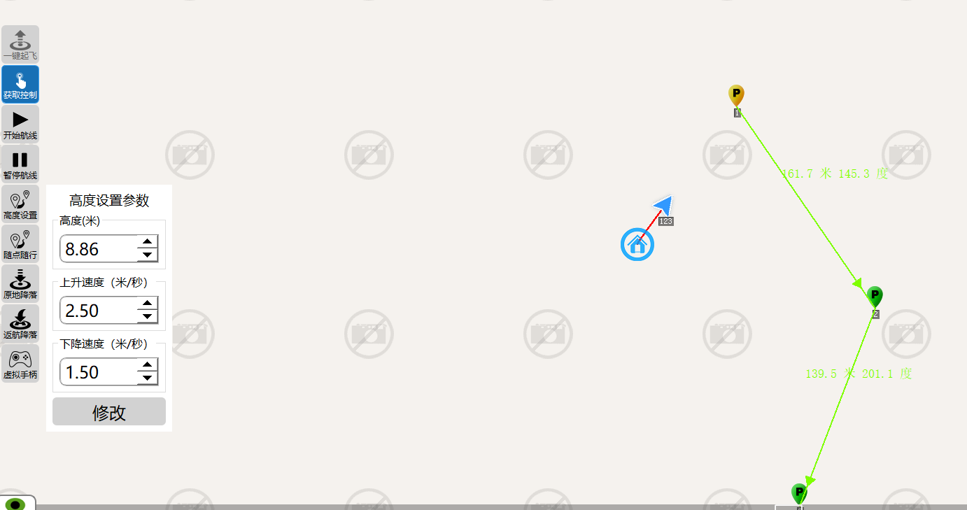 获取控制需要先进行一键起飞,或者手动起飞,点击获取控制后,下方的按钮均会变亮,意味着此时可以通过下方的按钮控制飞行器的操作。