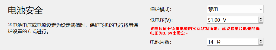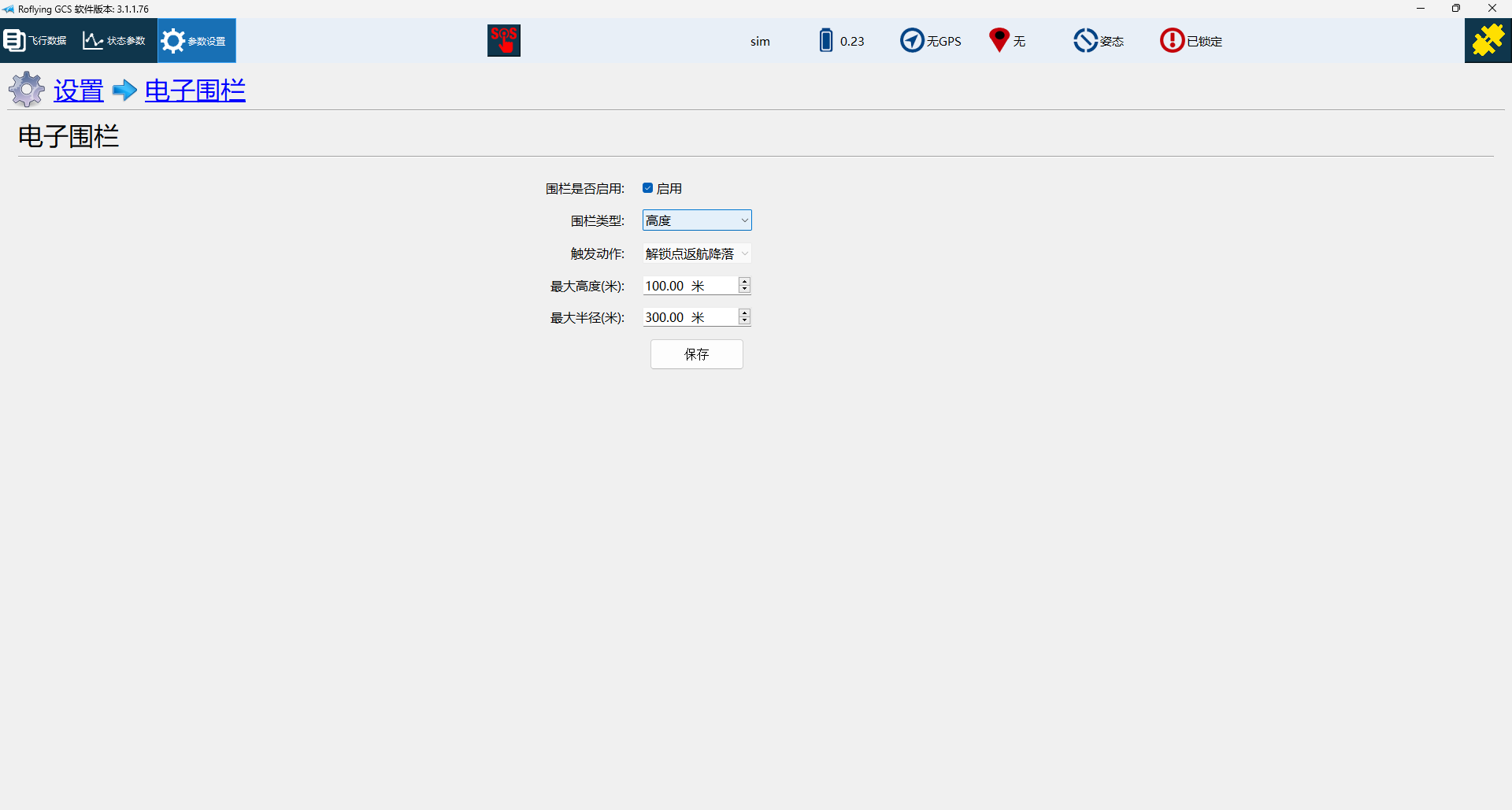 此处可以设置飞行器的安全飞行范围(也就是电子围栏),围栏类型中,可以设置高度,半径或两者结合,意味着飞行器一旦飞出半径为 300m(下方设置),高度为(100)m 的范围,立刻会触发电子围栏,此时的触发动作可以设置为返航降落或者仅显示(仅提醒)