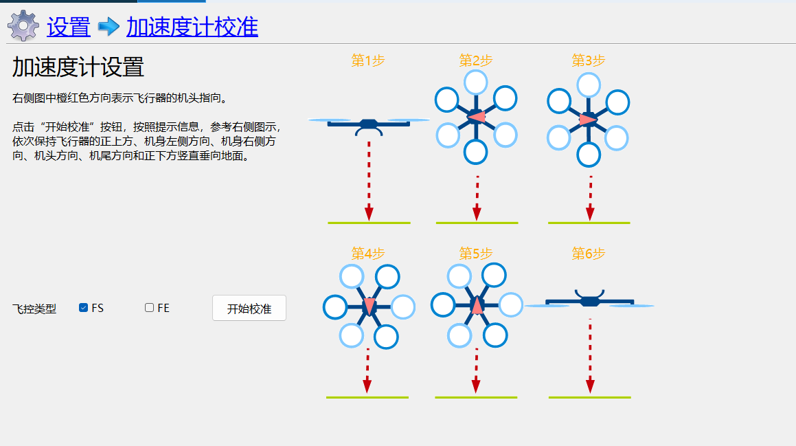 根据指示,选择 FE 飞控,点击开始校准,按照提示将飞控不同面一个个放置在同一水平面后点击下一步,直到完成校准