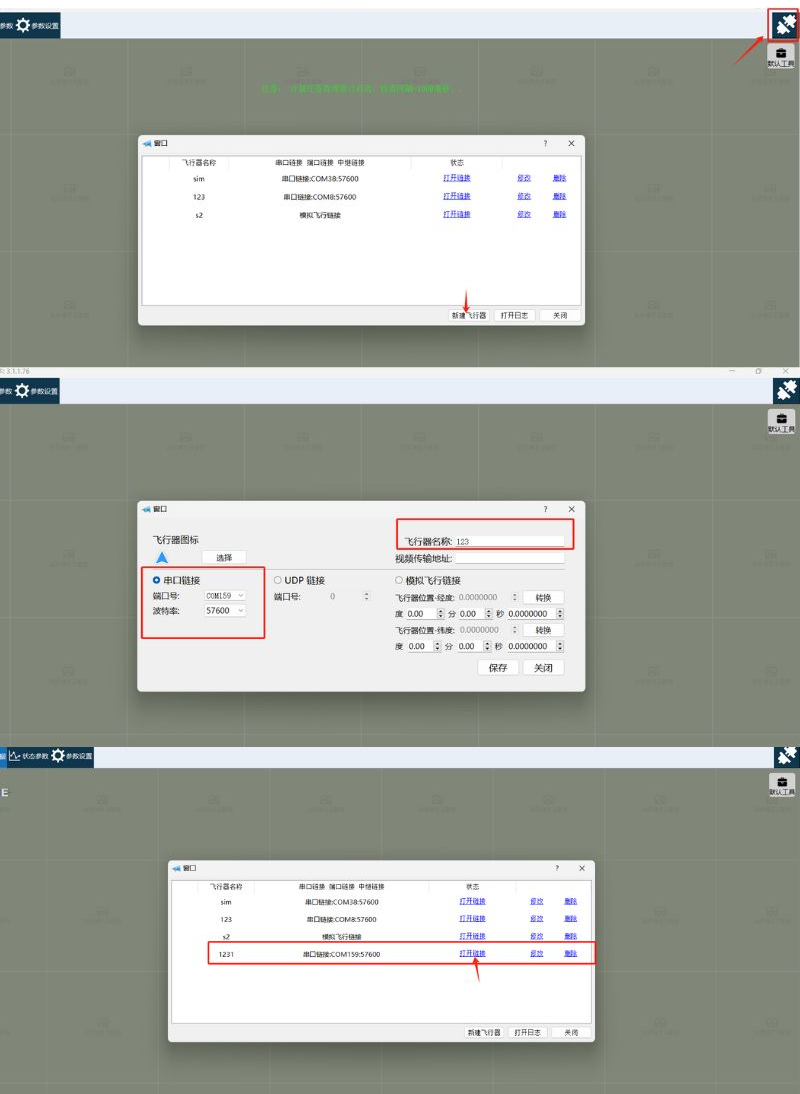 915 数传连接:将飞行器用电池供电,确保飞控开机,另一支 915 数传使用 USB 接上电脑端