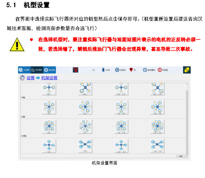 在界面选择实际的飞行器所对应的机型然后点击保存,要注意机架类型上标的电机转向和位置,与实际的是否一致