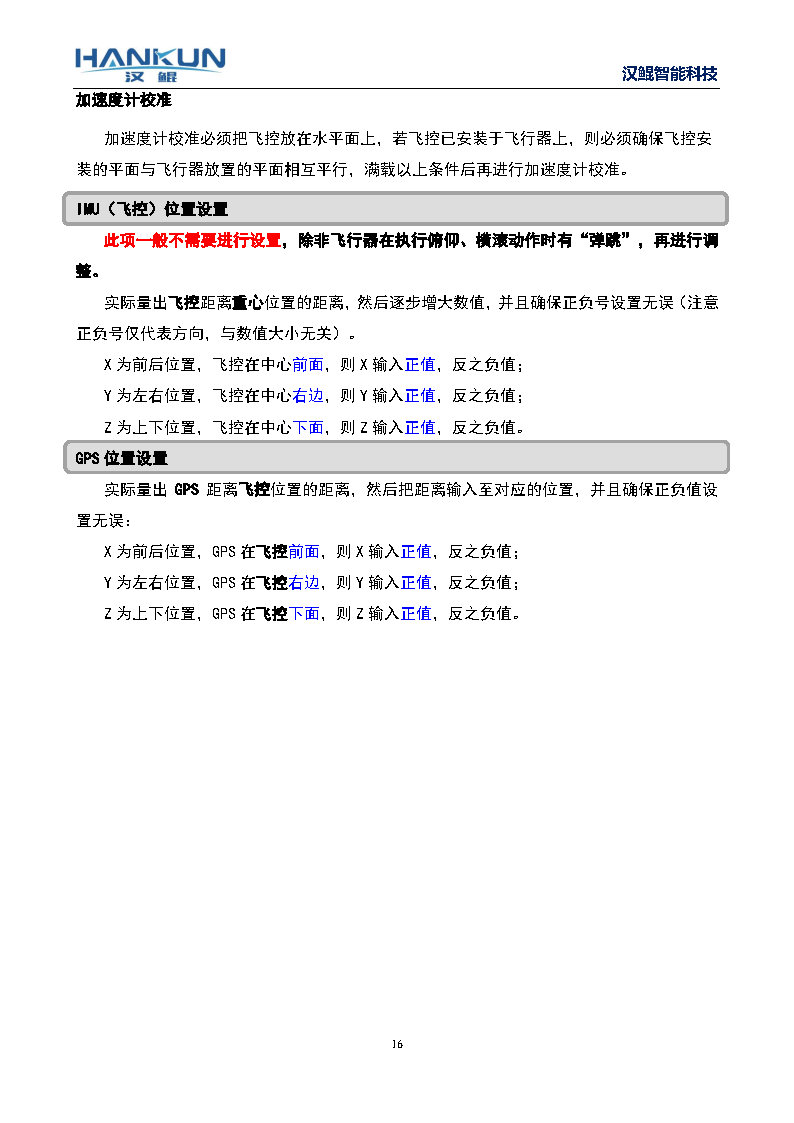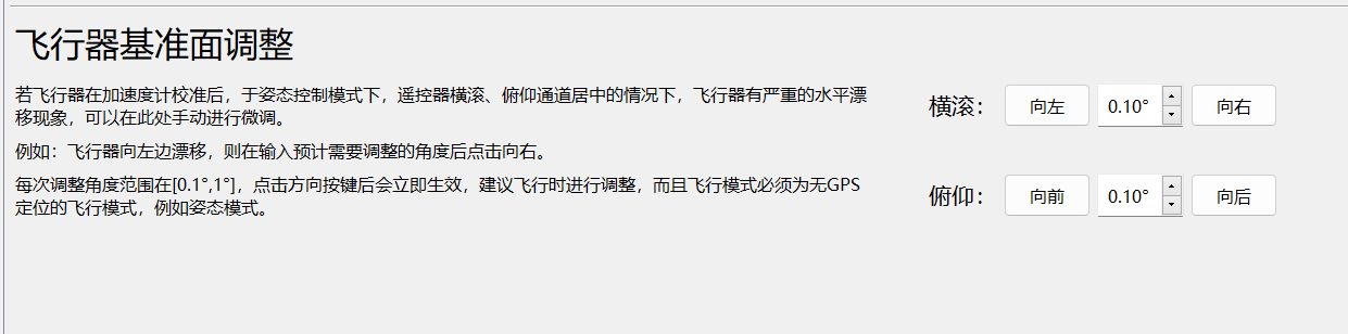 若飞行器在加速度计校准后,于姿态控制模式下,遥控器横滚、俯仰通道居中的情况下,飞行器有严重的水平漂移现象,可以在此处手动进行微调。