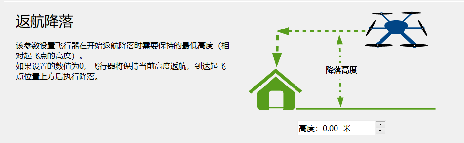 返航降落:飞行器以当前高度(默认当前高度,可以通过参数设置-参数设置中修改),先飞向返航点,再执行原地降落