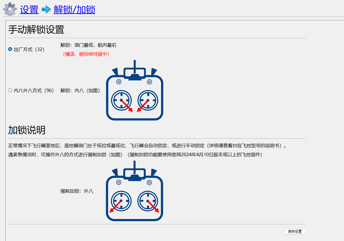 连上地面站后,可以在参数设置-解锁/加锁中设置自己喜欢的解锁方式